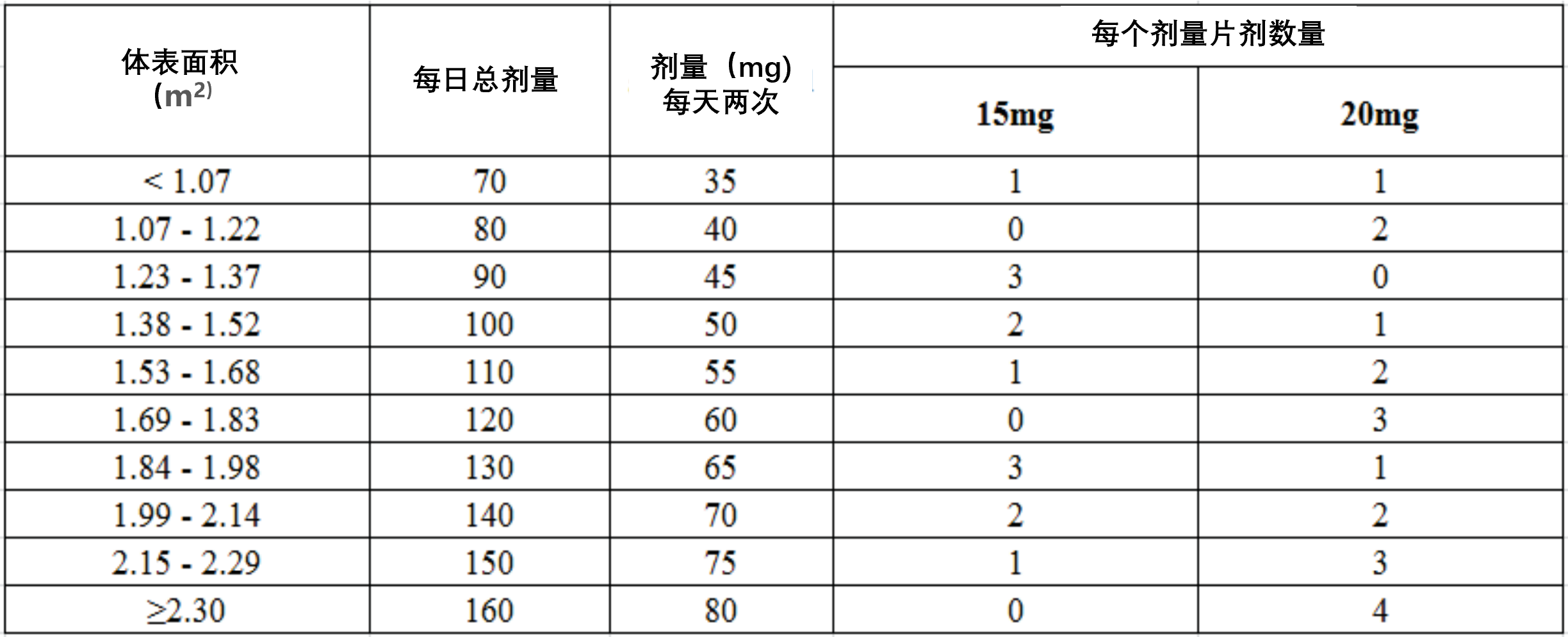 表1显示了根据体表面积(BSA)计算的初始每日剂量。
